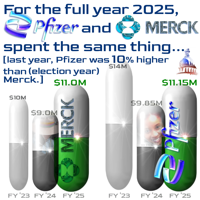 Here and now, though -- by comparing Merck, to last night's Pfizer summary disclosure listings, you will notice that either Merck describes its efforts in more rigorous detail, or Pfizer is slightly cutting corners, by not really disclosing the precise sorts of suasion it seeks, on the various pieces of pending legislation. Do take a look -- they spent essentially the same amount in 2025 -- at $11 million (and this year Amgen is up nearer $13.5 million):